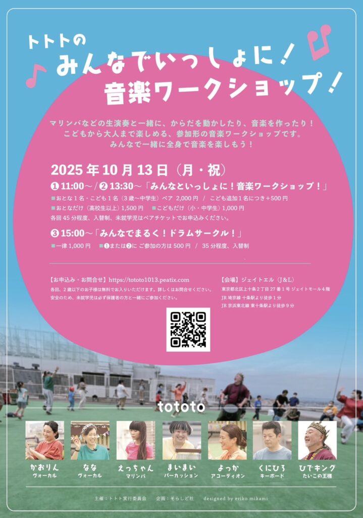 進行役をつとめる「トトト」は、2019年に共に音楽ワークショップのノウハウを学び、それぞれに多彩な活動をしている作曲家,演奏家,俳優などがタッグを組んだ アーティスト集団です。